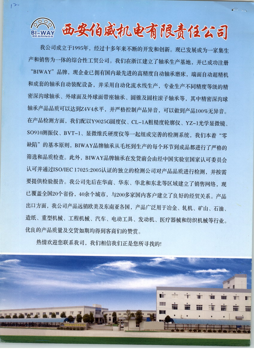 西安伯威機(jī)電貿(mào)易有限責(zé)任公司是一家專營(yíng)軸承及其相關(guān)產(chǎn)品的出口型貿(mào)易公司。我司從事軸承出口已有近十個(gè)年頭了,我們與國(guó)內(nèi)上百家軸承生產(chǎn)企業(yè)有著密切的聯(lián)系,積累了豐富的知識(shí)與經(jīng)驗(yàn),出口的軸承涉及各種類(lèi)型及品質(zhì),廣泛應(yīng)用于現(xiàn)代化的機(jī)械與家電行業(yè)。隨著國(guó)內(nèi)市場(chǎng)需求的發(fā)展,我們現(xiàn)在也準(zhǔn)備開(kāi)發(fā)國(guó)內(nèi)市場(chǎng)。 當(dāng)前國(guó)內(nèi)市場(chǎng)競(jìng)爭(zhēng)激烈,發(fā)展迅猛,機(jī)遇與挑戰(zhàn)無(wú)時(shí)不在,我們以“雙贏”為目標(biāo),慎密決策、長(zhǎng)遠(yuǎn)規(guī)劃,因?yàn)槲覀兪冀K相信:客戶信賴才是我們最具價(jià)值的意義所在,客戶的利益就是我們的利益所在,在此基礎(chǔ)上,我們將會(huì)為您及您的企業(yè)提供質(zhì)優(yōu)價(jià)廉的產(chǎn)品和熱情周到的服務(wù)。
