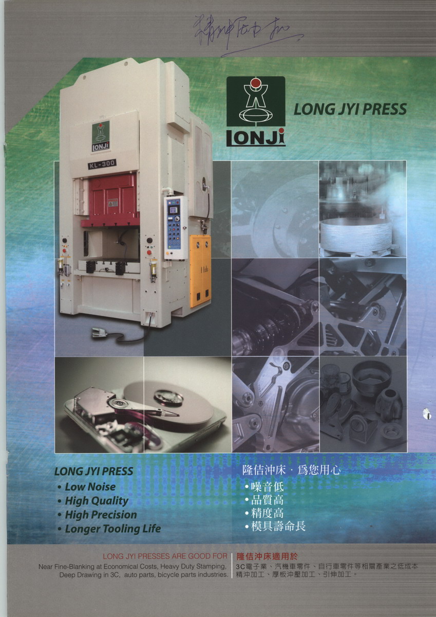 隆佶公司創(chuàng)立于1983年,生產(chǎn)專業(yè)之機(jī)械式?jīng)_床。多年來不斷以 二D 一A的理念來創(chuàng)新研發(fā)精良的產(chǎn)品,產(chǎn)品差異化(Differentiation)、精良的成本(Down cost),并站在客戶的角度預(yù)先研發(fā)(Advance research),讓產(chǎn)品更精進(jìn),并在沖床結(jié)構(gòu)及發(fā)明上獲得多項(xiàng)專利,使得沖床品質(zhì)精良,并具有優(yōu)越性能及多項(xiàng)優(yōu)點(diǎn),在業(yè)界已建立良好的口碑與專業(yè)形象。
