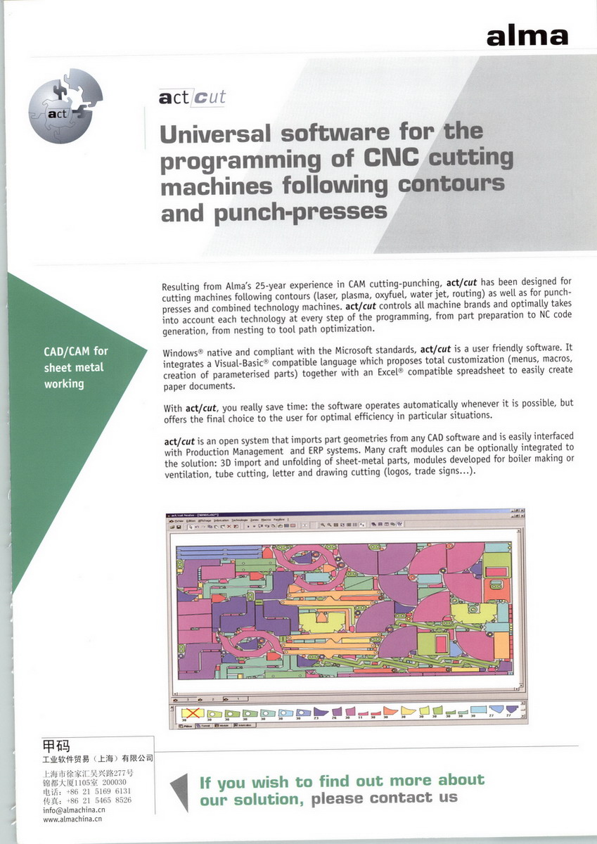上海甲碼工業(yè)軟件有限公司是一家專業(yè)的全自動(dòng)切割套料軟件公司,為法國(guó)獨(dú)資企業(yè)。在工業(yè)切割套料領(lǐng)域稱雄30年,適用于任何型號(hào)的等離子切割機(jī)、激光切割機(jī)及數(shù)控沖床、水切割機(jī)等。與同類型的軟件相比,Actcut能節(jié)省套料切割時(shí)間,提高材料利用率(5%-20%),并能與企業(yè)生產(chǎn)管理系統(tǒng)相結(jié)合,提高企業(yè)生產(chǎn)流程管理水平。甲碼軟件已與多家大型造船廠、鈑金加工企業(yè)有業(yè)務(wù)往來(lái)。在經(jīng)濟(jì)危機(jī)到來(lái)的今天,提高產(chǎn)品質(zhì)量,節(jié)約成本已經(jīng)成為企業(yè)刻不容緩的問題,甲碼的解決方案會(huì)給您一個(gè)驚喜,幫助企業(yè)度過難關(guān)!