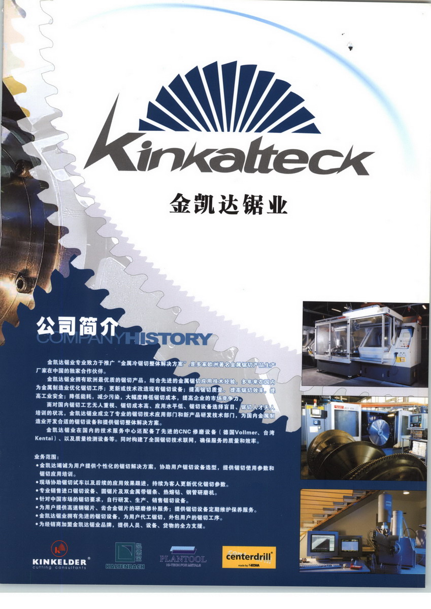 金凱達鋸業(yè)(KINKALTECK) 是一家專業(yè)致力于推廣“金屬冷鋸切成套設備解決方案”的服務型企業(yè)。代理國外著名金屬鋸切設備,鋼管鋼棒加工機械和金屬切割產(chǎn)品;經(jīng)營進口金屬圓鋸片、不銹鋼鋸片、高速鋼圓鋸片、雙金屬帶鋸條、高速圓鋸機、圓盤鋸、切管機、研磨機、拋光機、熱鉆、切鋁機、切斷機、磨齒機、帶鋸機、鋸床等,并提供鋸切設備維護及金屬切割技術咨詢服務。