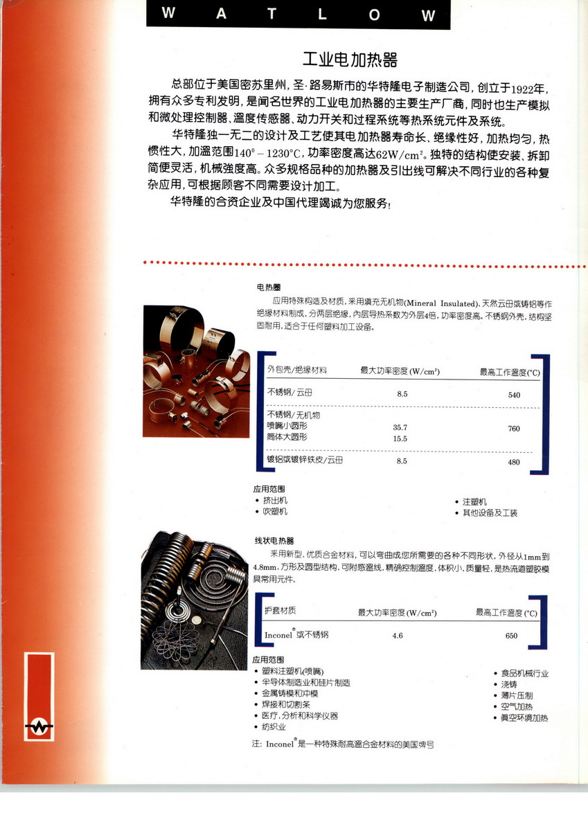 瓦特隆提供本行業(yè)最完整的設(shè)計和制造熱系統(tǒng)所有組成部份,包括工業(yè)加熱器,傳感器和控制器。因此我們不但能夠提供用戶標準統(tǒng)一的性能說明,也能根據(jù)您的設(shè)備和過程加熱的熱需求,為您推薦、研發(fā)和遞送適合您的理想熱系統(tǒng)方案。我們擁有超過85年為廣大行業(yè)客戶提供最創(chuàng)新的熱系統(tǒng)解決方案的經(jīng)驗。瓦特隆成立于1922年,至今依然是個家族企業(yè)。我們不但提高了生產(chǎn)能力和產(chǎn)品性能,也累積了豐富的市場經(jīng)驗,擴大了全球市場范圍。 我們擁有超過五十項專利,并在美國,墨西哥,歐洲和亞洲設(shè)有十間工廠,雇用超過兩千名員工。我們已在全球14個國家擁有銷售辦事處并且分銷網(wǎng)絡(luò)遍布全球。公司在取得飛速增長的同時對客戶的承諾始終不變– 根據(jù)客戶的不同需求為他們提供優(yōu)質(zhì)的產(chǎn)品和服務(wù)。