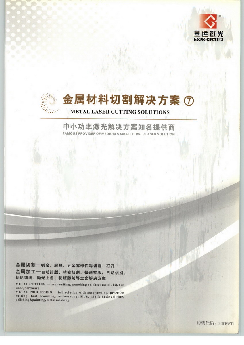 武漢金運激光股份有限公司,是專業(yè)集研發(fā)、生產(chǎn)和銷售于一體的中小功率激光切割加工解決方案提供商,2005年成立2011年上市,企業(yè)股票代碼:300220。