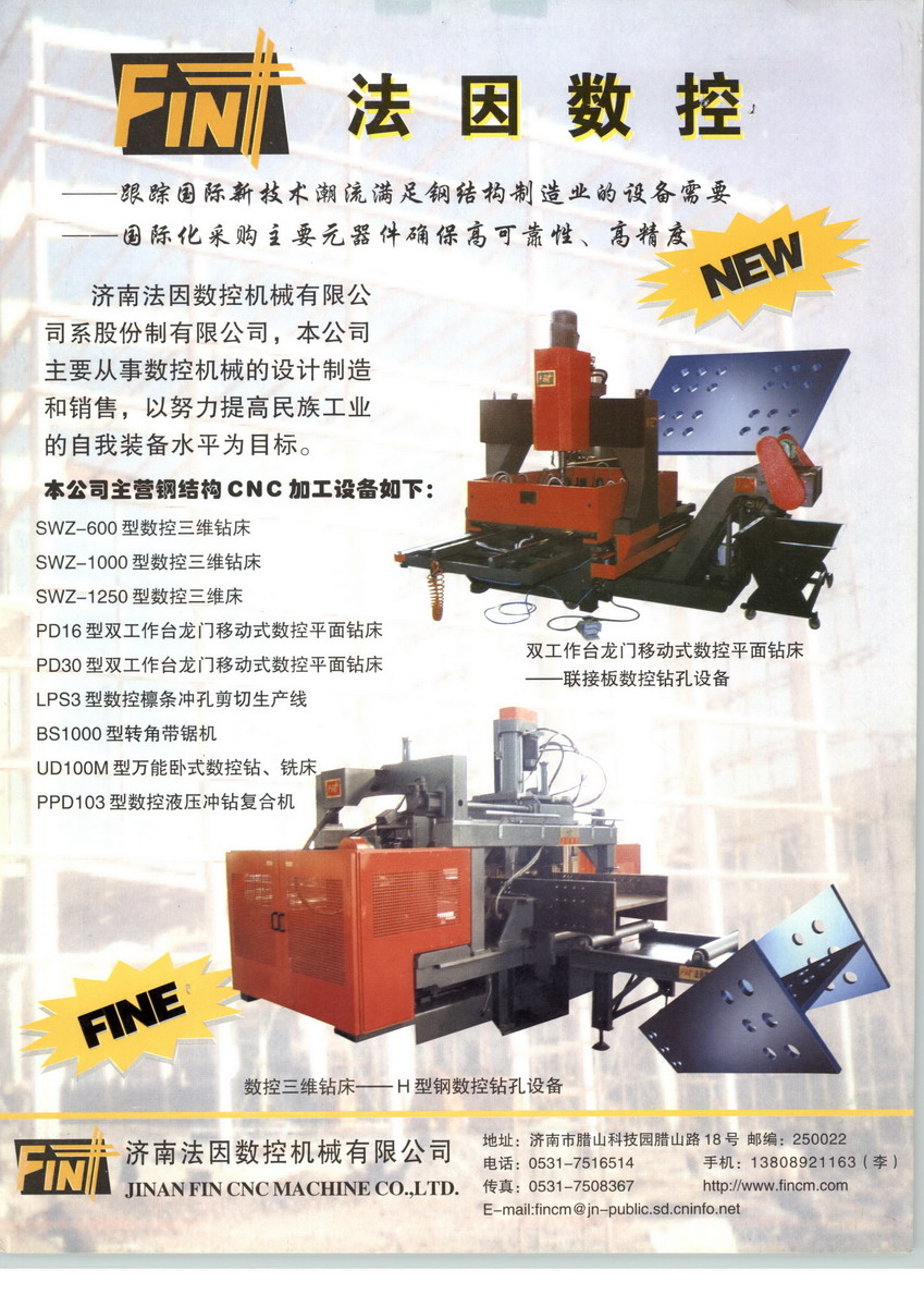 公司的主業(yè)突出、產(chǎn)品集中,其主營產(chǎn)品為鋼結(jié)構(gòu)系列數(shù)控成套加工設(shè)備,主要用于型鋼、板材、線材的數(shù)控加工,有效替代了同類產(chǎn)品的進(jìn)口?,F(xiàn)有主導(dǎo)產(chǎn)品具體分為五大類,高檔落地鏜銑加工中心、鐵塔數(shù)控加工設(shè)備、建筑鋼結(jié)構(gòu)數(shù)控加工設(shè)備、大型板材數(shù)控加工設(shè)備及汽車數(shù)控加工設(shè)備。公司產(chǎn)品通過數(shù)字化的操作程序,對型鋼和板材進(jìn)行鉆孔、沖孔、銑削、切割、鋸斷、打標(biāo)記等系列加工,并能實現(xiàn)多功能、多工序的自動連續(xù)生產(chǎn),充分體現(xiàn)了成套化、復(fù)合化、高效化、大型化、柔性化數(shù)控機(jī)床的特點,這也是國際數(shù)控裝備行業(yè)發(fā)展的主流趨勢。十年的孜孜以求,法因數(shù)控的多項產(chǎn)品列為國家級重點國際科技合作項目、科技攻關(guān)項目、火炬計劃項目和國家重點新產(chǎn)品計劃項目,并多次榮獲科技進(jìn)步獎、省市先進(jìn)企業(yè)和誠信守法企業(yè)稱號。