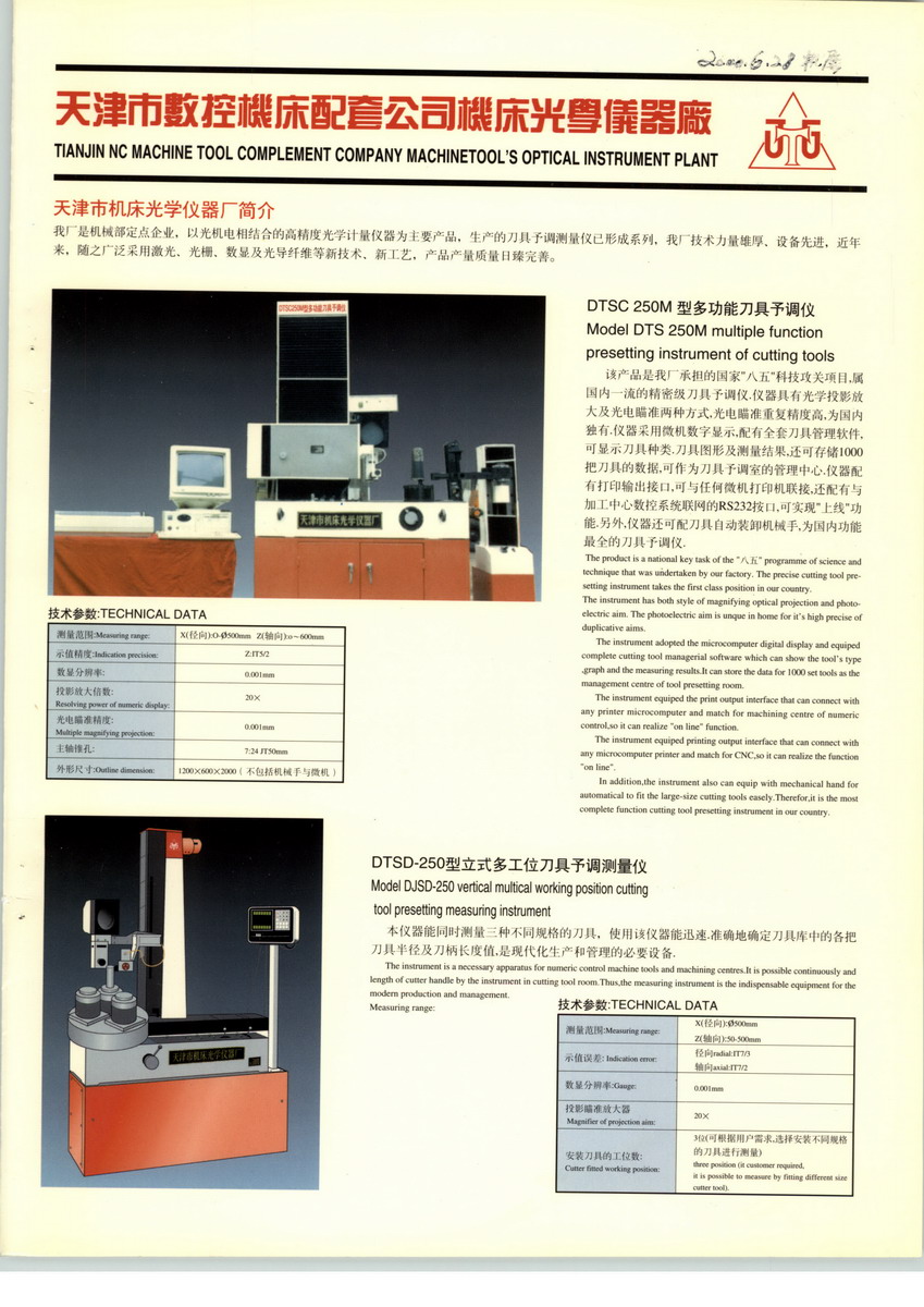 我廠為天津市數(shù)控機床配套有限公司機床光學儀器廠,是1969年由天津市機床工具研究所轉制的集光、機、電一體的技術密集型企業(yè)。本企業(yè)擁有先進的技術,精良的設備,完善的測試手段和可靠的質量保證體系。我廠有完整的機械設計加工能力,光學設計制造能力,電氣設計試驗能力,是國家二級計量單位,國家技術監(jiān)督局頒發(fā)的《制造計量器具許可證》,機械、光學、電氣設計工作均由高級工程師主持完成,保證了產品的先進性,質量的可靠性。我廠開發(fā)研制的產品分別榮獲新產品獎、天津市新產品二等獎、天津市科技進步等獎,天津市優(yōu)質產品稱號等。我們分別參加了國家“七五”和“八五”規(guī)劃中《多功能數(shù)控刀具預調儀的研究》課題的研制工作(國家三級合同)并圓滿完成任務。通過組織專家的審評,認為我廠研制的機外刀具預調測量儀達到國際同期先進水平,完全可以替代進口產品,我廠產品為機、光、電一體化產品,技術含量高,具有一定的先進性,產品銷售覆蓋全國各地部分產品銷往歐、亞、美地區(qū),在國內外有一定的盛譽。