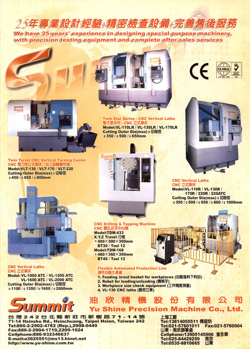 油欣精機自1983年成立以來,以設(shè)計專用機的理念,陸續(xù)拓展至各式CNC立式車床、復(fù)合車削中心機、雙刀塔立式車床、五軸龍門車銑復(fù)合加工中心機……的設(shè)計制造。獨到前瞻的眼光,加上大膽創(chuàng)新的精神,引領(lǐng)油欣順應(yīng)全球市場脈動,推出各式廣受好評的機種。精湛的技術(shù)與嚴格的品管政策,更讓油欣所生產(chǎn)的產(chǎn)品,全面通過CE、ISO9001品管認證,高精度與高準度的優(yōu)異加工表現(xiàn),深受國內(nèi)外廠商客戶的認可與信賴,成功外銷至日本、歐洲、德國、中南美洲、東南亞與東歐等38個國家。