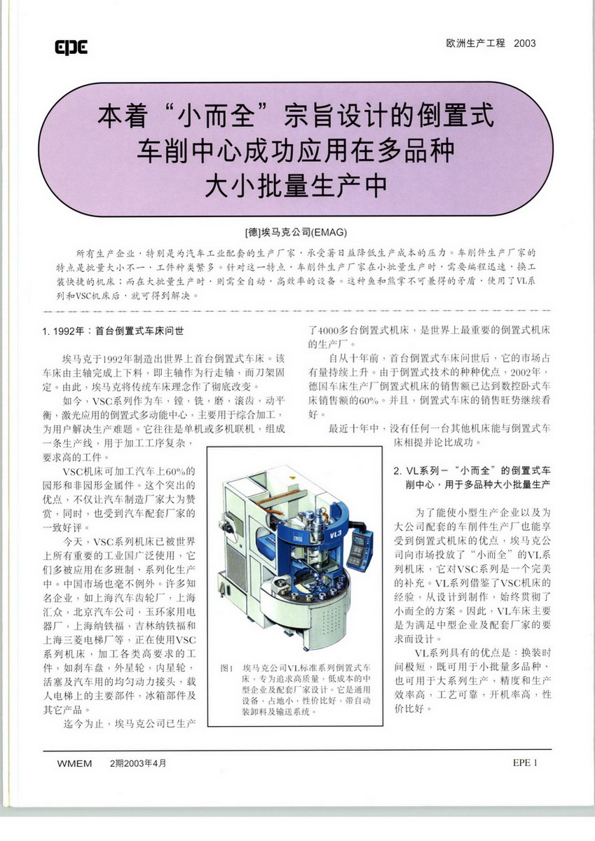 埃馬克為中型企業(yè),它的成功戰(zhàn)略是能及時預測用戶需求,并根據用戶需求靈活應變。 用戶在尋找新機床時首先要考慮的核心問題是新機床能幫助他提高生產效率和加工質量,同時希望機床占地不多并能可靠加工,即使使用多年后仍能不負眾望可靠生產。埃馬克已成為世界上CNC倒置式機床舉足輕重的制造商。