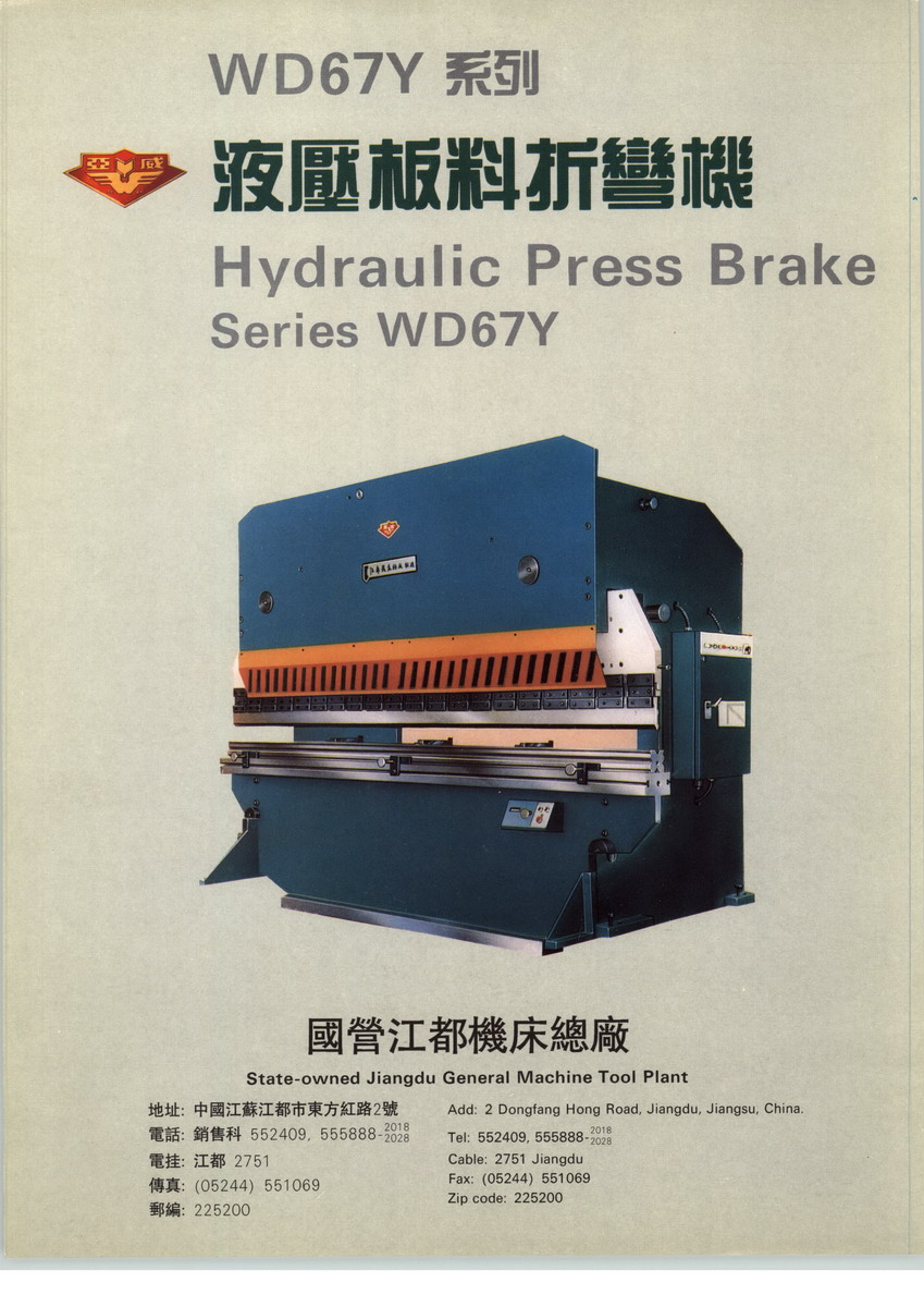 全國折灣機(jī)、剪板機(jī)產(chǎn)銷量最大的企業(yè)──江都機(jī)床總廠廠長袁以信創(chuàng)建于1956年的國營江都機(jī)床總廠,是機(jī)械工業(yè)部定點專業(yè)生產(chǎn)板料加工機(jī)械的省屬中型企業(yè),現(xiàn)有職工1000余名,專業(yè)技術(shù)人員205人,其中,具有高級職稱的10多人,中級職稱的40多人,占職工總數(shù)的20%以上。全廠占地面積近12萬平方米,廠房面積21700平方米,擁有固定資產(chǎn)原值3000多萬元,各類加工設(shè)備260余臺,精大稀設(shè)備30臺,機(jī)械加工設(shè)備和檢測手段完備。全廠現(xiàn)有六個生產(chǎn)車間和板焊、鑄鍛、熱處理、模具四個專業(yè)化分廠。廠辦機(jī)械研究所,具有產(chǎn)品開發(fā)設(shè)計能力,每年可自行開發(fā)新品2~3個。現(xiàn)行主產(chǎn)品為:16t、25t、40t、63t、100t、160t、250t、400t8個品種的板料折彎機(jī)(有普遍的和數(shù)控的);63t和100t的PC控制或數(shù)控折剪兩用機(jī);6×2500、6×3200、8×5000、12×3200、16×2500、20×3200、32×25007個品種的液壓剪板機(jī)(有普通的和數(shù)控的)。