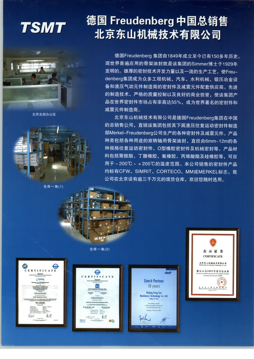北京東山機(jī)械技術(shù)有限公司(TSMT)成立于1994年,是香港東山工程有限公司(TSE)董事長(zhǎng)在1992年成功將世界最大的密封件與減震元件制造商德國(guó)FREUDENBERG密封與減震技術(shù)集團(tuán)公司(FDS)產(chǎn)品引進(jìn)中國(guó)后,專門在北京注冊(cè)成立的一家香港獨(dú)資企業(yè),全面負(fù)責(zé)德國(guó)FDS集團(tuán)產(chǎn)品在中國(guó)市場(chǎng)的銷售和推廣。