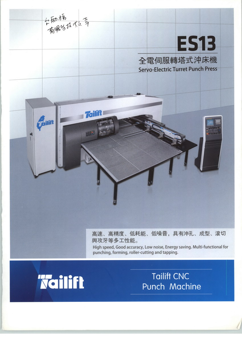 臺(tái)勵(lì)福CNC數(shù)控沖床全系列產(chǎn)品自正式銷售以來(lái),已第二次榮獲經(jīng)濟(jì)部工業(yè)局認(rèn)定為精密機(jī)械類主導(dǎo)性新產(chǎn)品,此外,臺(tái)勵(lì)福CNC數(shù)控沖床也是臺(tái)灣境內(nèi)唯一通過(guò)ISO認(rèn)證與獲頒多項(xiàng)專利之高科技數(shù)控沖床。數(shù)控沖床機(jī)種由3尺x6尺到5尺x 10尺之鈑金加工,高品質(zhì)高效率,可搭配全自動(dòng)送料系統(tǒng),是省時(shí)省工的自動(dòng)化設(shè)備。