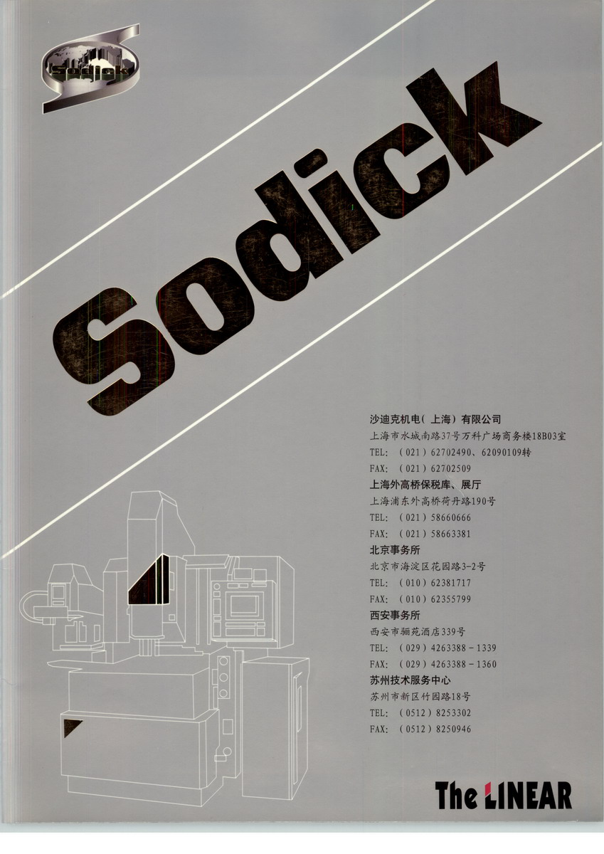 SODICK 公司是專業(yè)生產(chǎn)開發(fā)模具生產(chǎn)設(shè)備的日本企業(yè).主要產(chǎn)品有: 慢走絲線切割機,放電成型火花機.打孔機等模具生產(chǎn)設(shè)備.SODICK 研制的線性馬達(dá)控制系統(tǒng).曾榮獲日本機械行業(yè)的多項獎項.由于使用了線性馬達(dá)控制,使得加工出的產(chǎn)品精確度大大提高.與傳統(tǒng)的馬達(dá)控制系統(tǒng)無法相提并論. EDW SERIES: AQ550L AQ535L AQ325L AP200L EDM SERIES: AQ35 AQ25 AM35.