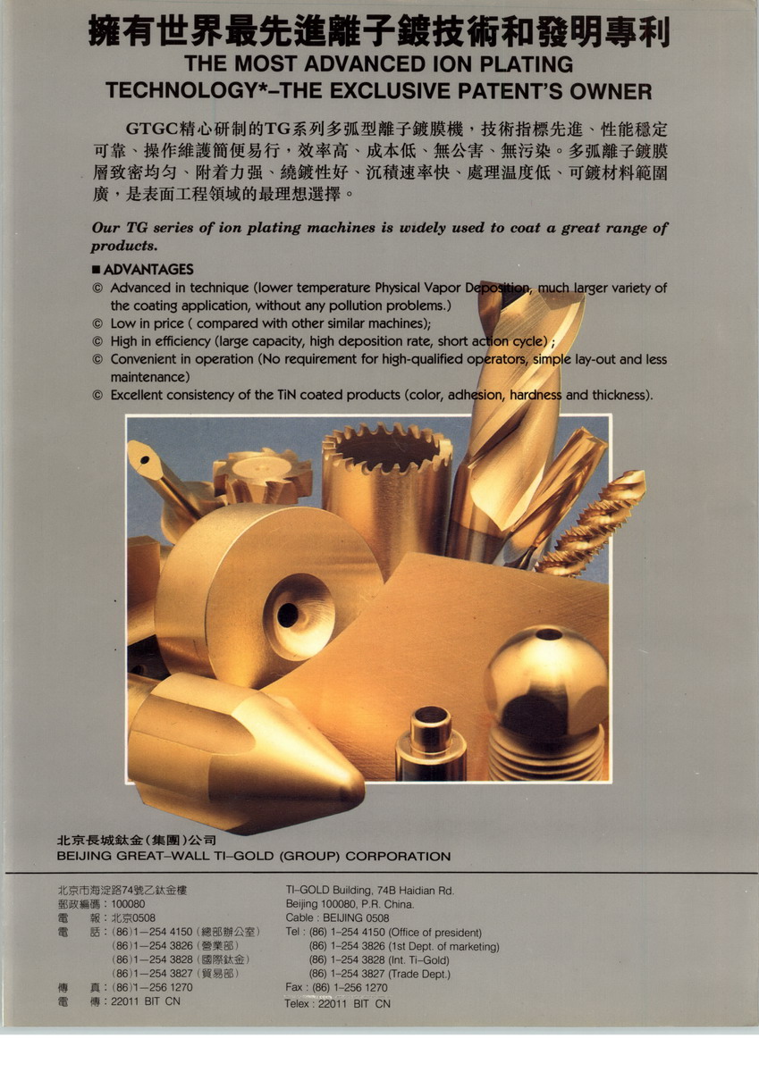 北京長城鈦金公司致力于鍍膜技術(shù)的研究與應(yīng)用,是中國首屈一指的物理蒸 氣沉著(PVD)鍍膜技術(shù)的科研成果開發(fā),設(shè)備制造和銷售中心。真空離子鍍膜的第 三代技術(shù),等離子體加速器型離子鍍膜法,是當今國際上最先進的表面工程技術(shù) 之一,也是復(fù)合材料領(lǐng)域里的一項高難課題。用此法得到的膜層,除具有細密均 勻,結(jié)合力強,超硬,耐磨,抗腐蝕,良好的導(dǎo)電性能和自潤滑性能等優(yōu)點,還 能提供豐富華麗的色彩。本公司生產(chǎn)的TG系列設(shè)備,可用來鍍單層或復(fù)合層 的TiN,ZrN,TiO,TiC,TiNC,TiAlN或稀貴金屬Au,Ag,Ta,Nb,Mo,W等裝飾 和功能涂膜??捎糜阽姳恚罪?,燈具,餐炊器具,五金工藝,玻璃,陶瓷,衛(wèi) 浴和建筑材料等類似產(chǎn)品的表面鍍膜,其特點是色彩豐富、品質(zhì)高貴。另一方面 ,鈦金功能鍍在工具,模具,重型機械,航空,航天,艦船,兵器和電子等領(lǐng)域 也有日益廣泛的應(yīng)用前景:硬質(zhì)的功能膜層不僅可以提高工件的使用壽命,而且 提高切削速度,表面光潔度和抗腐蝕性與耐磨性,大大地提高機械制造業(yè)的自動 化程度。作為同行業(yè)的龍頭,長城鈦金公司為適應(yīng)國際化的需要,又率先將 TG系列離子鍍膜設(shè)備提高到了國際水準:成為中國同行業(yè)里唯一的企業(yè),既達到 美國的UL標準,又獲得歐洲的CE證書 公司后續(xù)引進開發(fā)爆炸噴涂設(shè)備,歡迎到北京長城鈦金公司訪問考察!