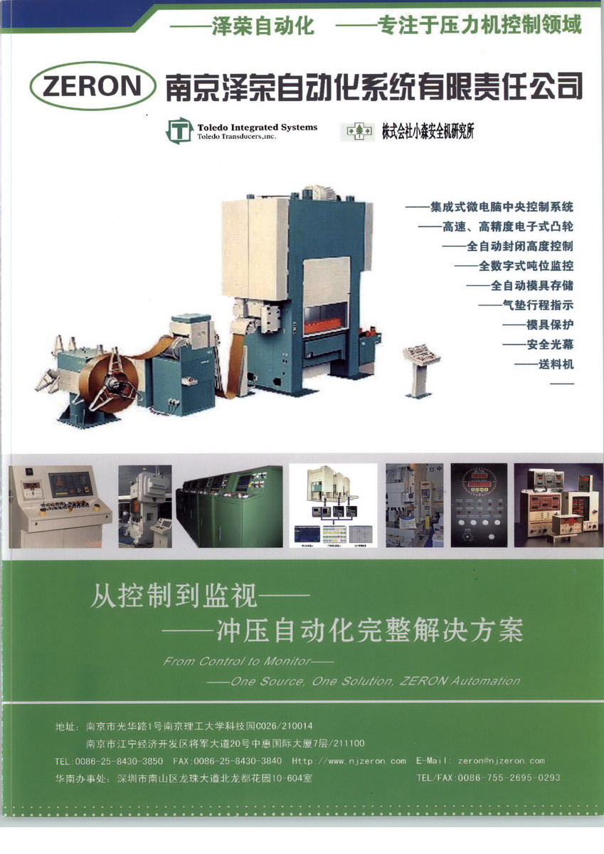 南京澤榮自動化系統(tǒng)有限責(zé)任公司(ZERON AUTOMATION)---致力于鍛壓行業(yè)的自動化控制系統(tǒng)制造商,秉承全心專著、精致服務(wù)和領(lǐng)先技術(shù)業(yè)已贏得在中國同行業(yè)中的領(lǐng)軍行列。進(jìn)行國際化合作是公司一貫主張,為與此行業(yè)的世界強(qiáng)手進(jìn)行學(xué)習(xí)公司與美國、日本、臺灣、韓國、印度等高科技公司建立了深層次的商業(yè)合作,先進(jìn)的理念和軟、硬件技術(shù)使公司成為鍛壓自動化行業(yè)的潮流倡導(dǎo)者。專業(yè)才能贏得市場---公司以此為經(jīng)營宗旨,我們從控制到監(jiān)視為沖壓自動化提供完整的方案和成套設(shè)備。產(chǎn)品涵括:美國TOLEDO壓力機(jī)噸位數(shù)字式監(jiān)控系統(tǒng)、中小型及高速壓力機(jī)控制系統(tǒng)、電子凸輪、轉(zhuǎn)角指示、模高控制、小森安全光幕以及全集成的電氣控制柜等整體電氣自動化方案。提供有價(jià)值的產(chǎn)品和服務(wù)讓我們與客戶取得了持續(xù)的合作,在眾多的工廠沖壓車間里,可很容易的看到有我們提供的產(chǎn)品在工作。