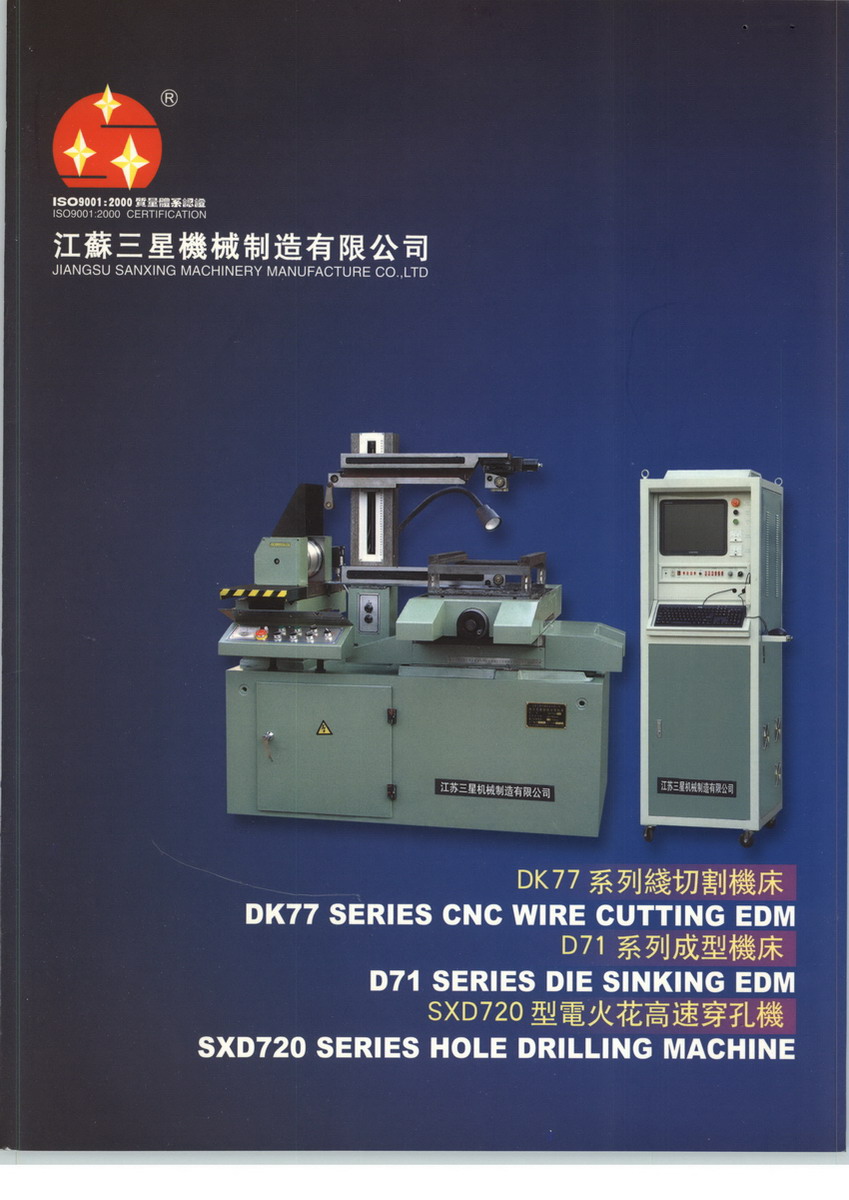 江蘇三星機(jī)械制造有限公司是國內(nèi)跨行業(yè)的機(jī)械制造企業(yè),集開發(fā)、生產(chǎn)、銷售為一體,連續(xù)多年被評為泰州市明星企業(yè),通過ISO9001國際質(zhì)量認(rèn)證,2004年元月通過ISO9001:2000版換版審核。多年來,公司員工弘揚(yáng)“團(tuán)結(jié)拼搏,自強(qiáng)務(wù)實(shí)”的精神,產(chǎn)品質(zhì)量以及技術(shù)含量不斷提高。公司占地面積45000平方米,建筑面積34600平方米,員工500多人,其中中、高級工程技術(shù)人員70人,加工設(shè)備精良,檢驗(yàn)設(shè)備齊全,是江蘇省技術(shù)監(jiān)督局確認(rèn)的計量合格單位,部分產(chǎn)品免檢出口,連續(xù)十多年被評為“重合同守信用單位”。主要產(chǎn)品有:dk77系列電火花線切割機(jī)床、d71系列電火花成型機(jī)床、sxd720系列高速電火花穿孔加工機(jī)床、xk系列數(shù)控機(jī)床、xh系列數(shù)控加工中心、sxdk系列數(shù)控雕刻機(jī)、sxsl系列高壓水射流切割機(jī)、hgl-300多功能固體激光加工機(jī)、洗滌設(shè)備、電動滾筒、過濾機(jī)械等。本廠一貫奉行“質(zhì)量第一,用戶至上”的原則,以市場為導(dǎo)向,以滿足用戶的需求為宗旨,熱忱為廣大顧客服務(wù)。